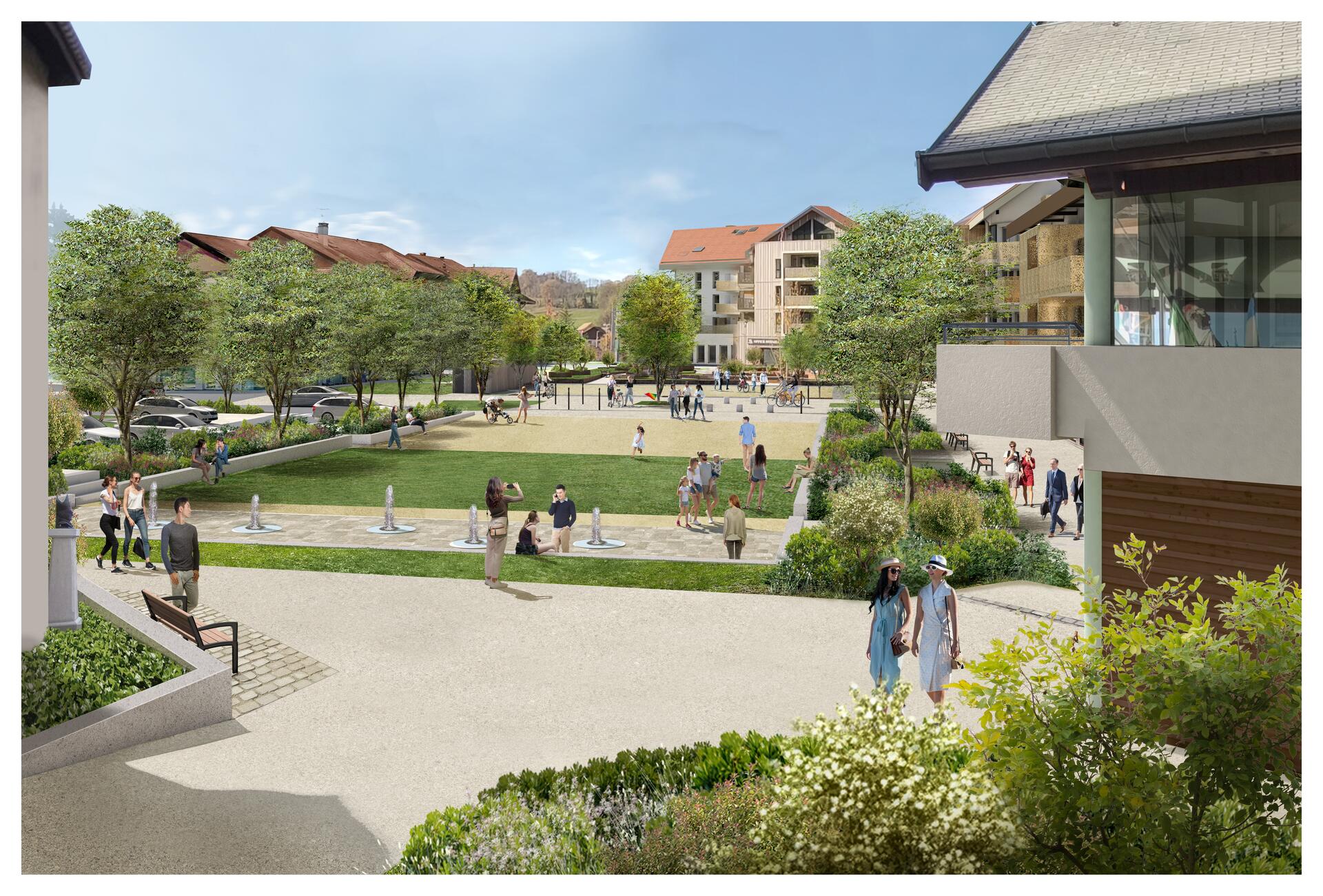 L'objectif est de créer un espace de rencontre convivial, vivant et accueillant, tout en renforçant la centralité du bourg. Le projet prévoit l'aménagement de la place de la marie et du parc des Fartoz. Il comprend la mise en valeur de l'église et de ses parvis, la création de nouvelles places de stationnement, facilitant l'accès aux commerces, le repositionnement du Monument aux morts et l'installation d'une fontaine sèche en centre-bourg.