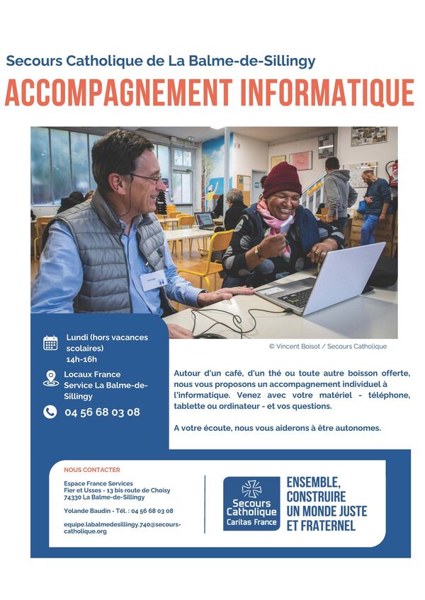 Le Secours Catholique de La Balme de Sillingy organise des séances d'accompagnement individuel à l'informatique.
