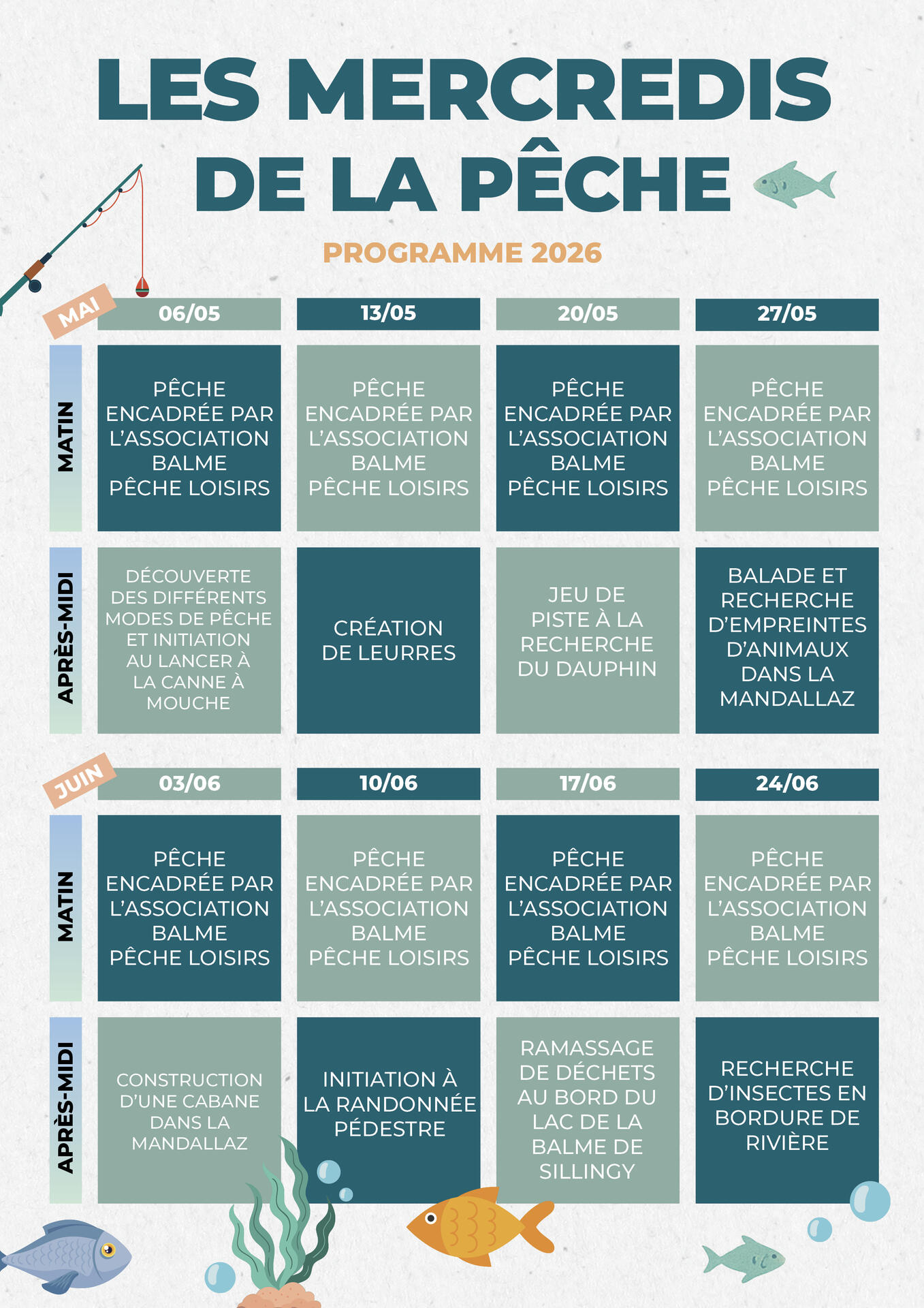 - Matinée – Initiation à la pêche : découverte du matériel, des techniques et sensibilisation à la pêche avec l’association Balme Pêche Loisirs