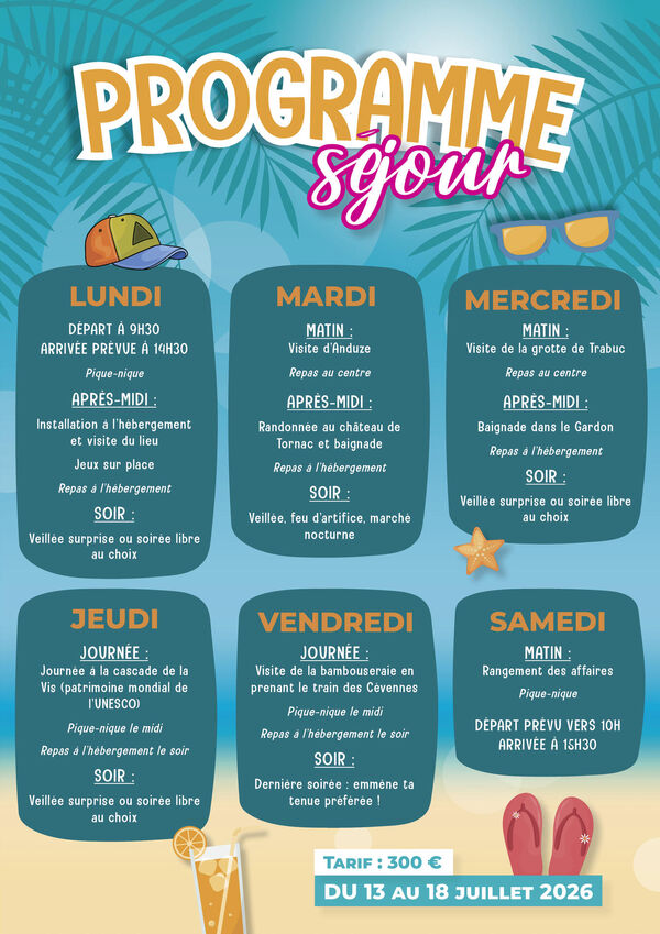 L’accueil de loisirs organise un séjour destiné aux jeunes de 11 à 16 ans, du 13 au 18 juillet 2026, dans le cadre naturel et dynamique d’Anduze, au cœur du département du Gard.