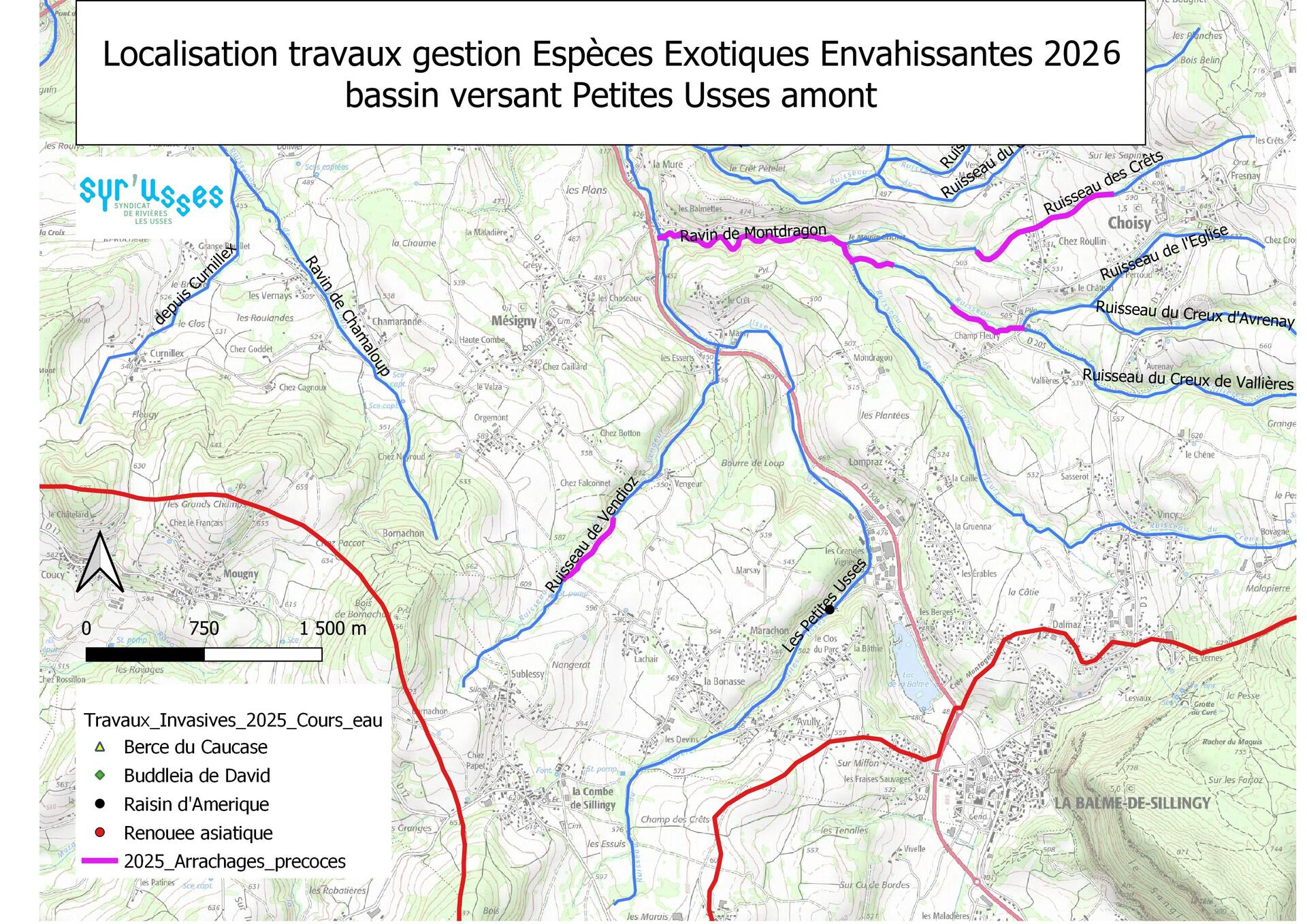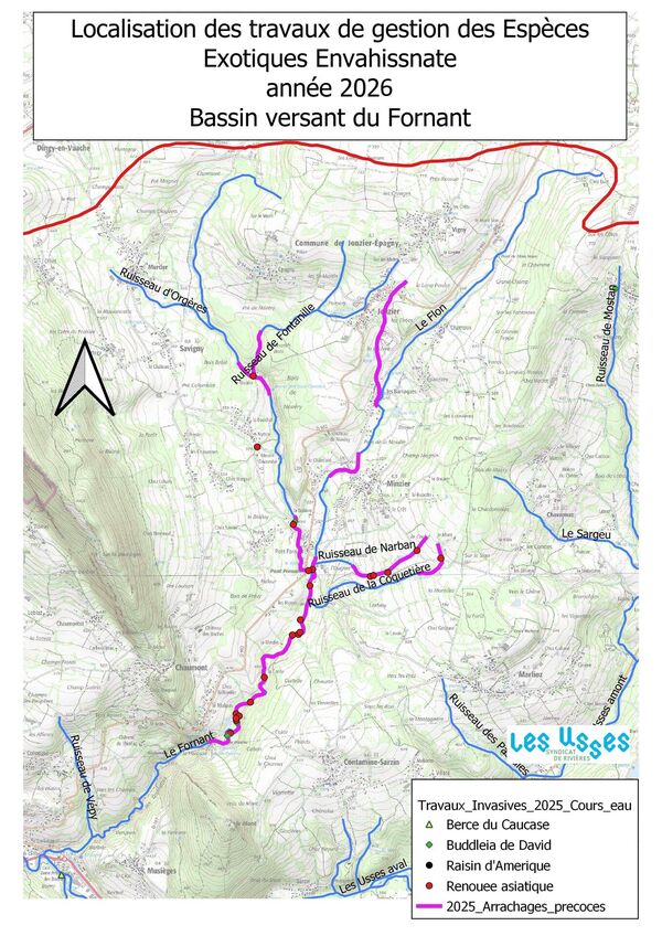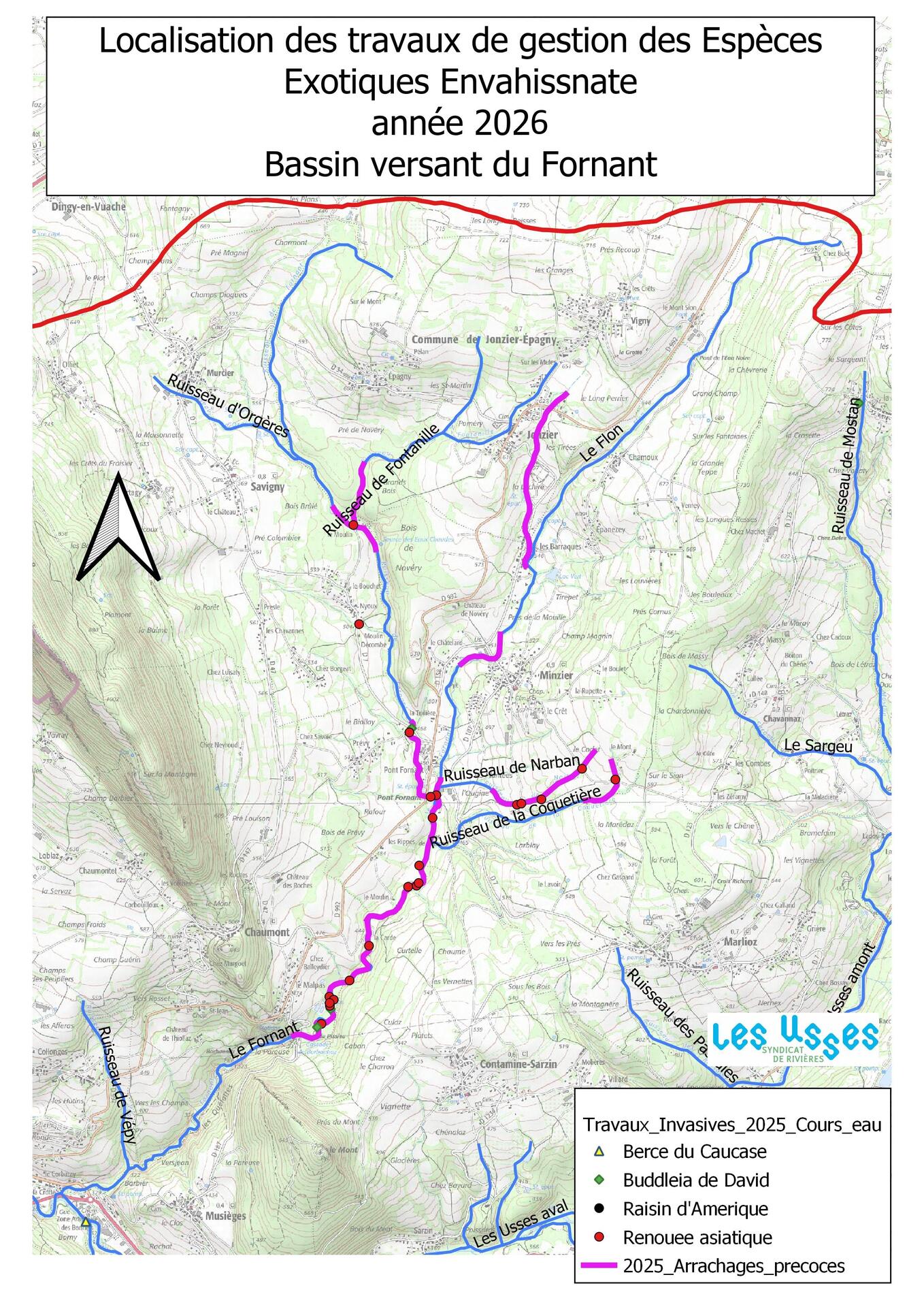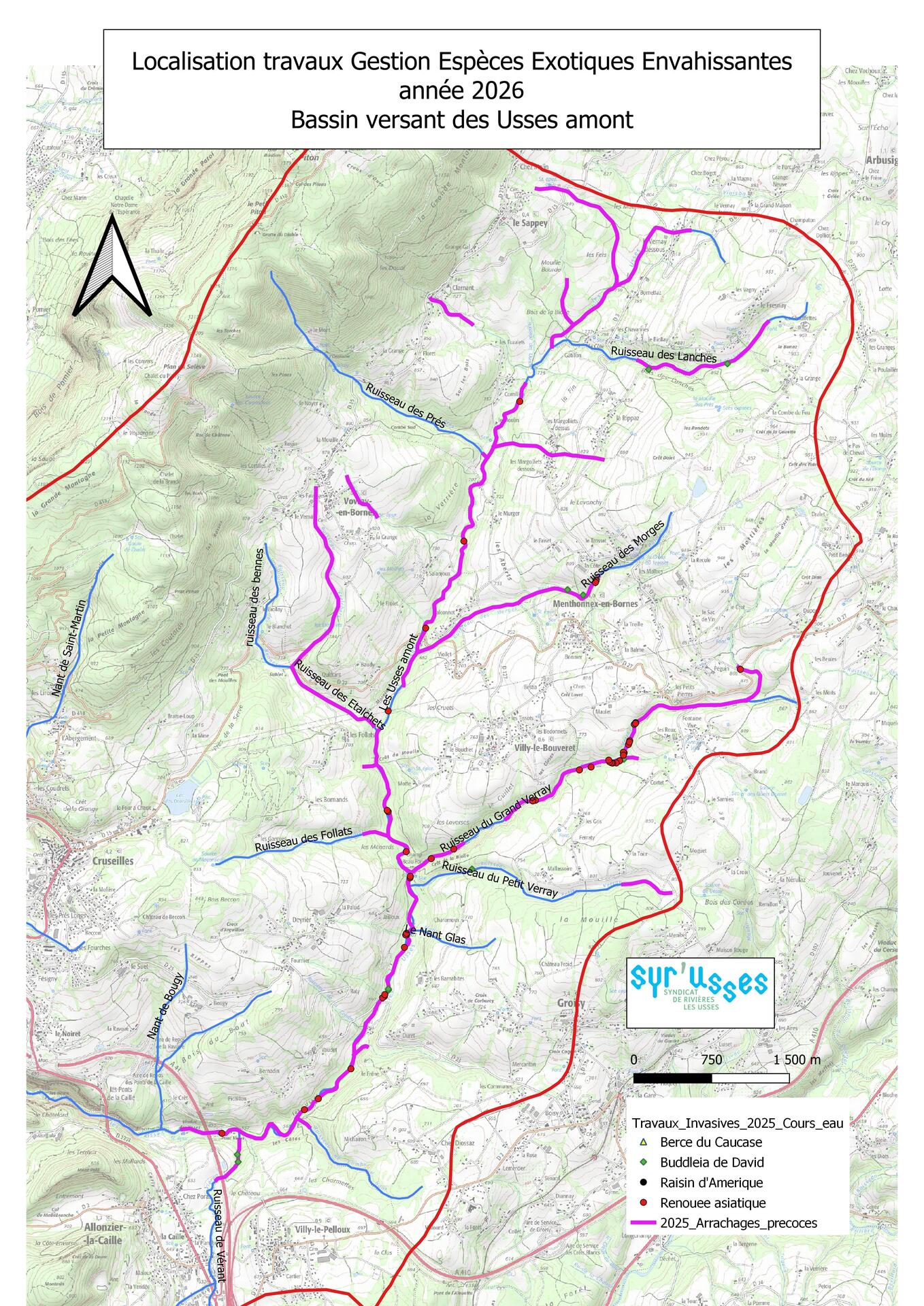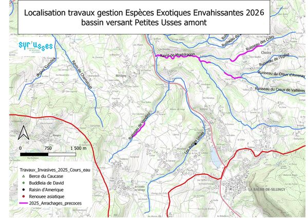 La prochaine campagne a débuté le 15 avril. Dans ce cadre, le Syr’Usses a mandaté l’Office National des Forêts pour réaliser des travaux de fauche et d’arrachage ciblés d’espèces exotiques envahissantes sur les affluents identifiés comme prioritaires du bassin versant.