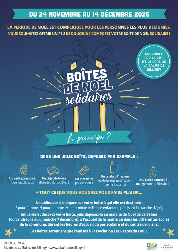 À l'approche des fêtes de fin d'année, le CMJ et le CCAS de La Balme lancent une collecte de boîtes de Noël solidaires, afin d'offrir un peu de douceur aux personnes les plus démunies.