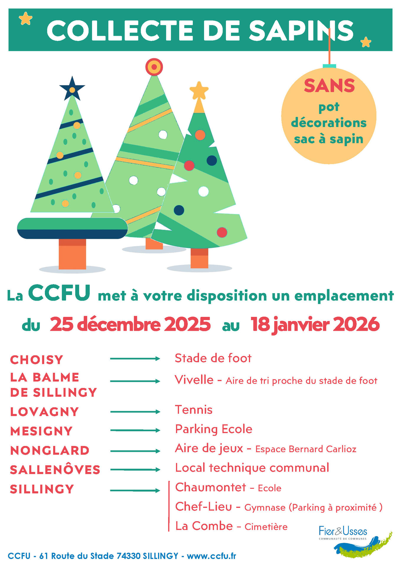 Du 25 décembre 2025 au 18 janvier 2026, les habitants de La Balme de Sillingy pourront déposer leurs sapins de Noël à l'Aire de tri de Vivelle, située à proximité du stade de football.