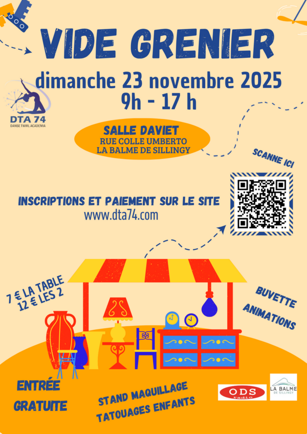 L'association DTA 74 organise un vide-grenier à la salle G.DAVIET de 9h à 17h.